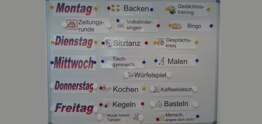 Unsere Tagespflegestätte ist täglich von Montag bis Freitag von 8.00 Uhr bis 16.00 Uhr geöffnet. Neben den grundpflegerischen Regelleistungen und einer abwechslungsreichen Verköstigung werden verschiedene Aktivitäten angeboten, so z.B. Gymnastik, Singen, Kochen, Backen, Ausflüge, Gedächtnistraining und vieles mehr.